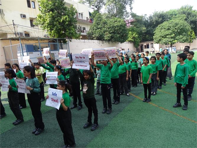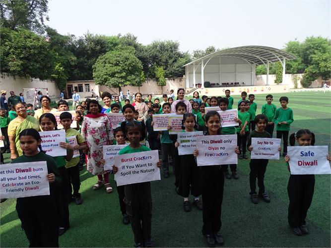 After the function, an Anti-Cracker Rally was organized to spread the message of celebrating a safe and eco-friendly Diwali. The students held banners and chanted slogans, encouraging everyone to avoid bursting crackers and to celebrate responsibly.Each class also participated in creative festive activities such as Rangoli making, mix nuts preparation, and Diwali card making. The classrooms were beautifully decorated by the students, showcasing their creativity and enthusiasm. The entire school echoed with happiness and festive cheer, making it a memorable celebration for all.